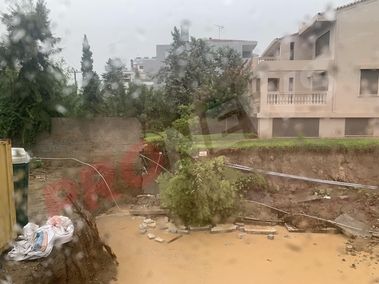 Συγκεκριμένα, ένα οικόπεδο, στο οποίο είχαν σταματήσει επί χρόνια λόγω εύρεσης αρχαίων, οι εργασίες ανοικοδόμησης συγκροτήματος πολυτελών κατοικιών, πλημμύρισε, έριξε το μεγαλύτερο μέρος της τσιμεντένια μεσοτοιχίας με την δεξιά πολυτελή οικία, η οποία «έχασε» το μισό οικόπεδό της το οποίο βυθίστηκε μέσα στο νερό.