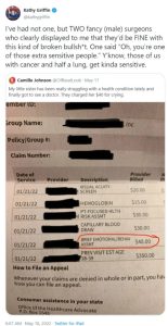 Σε ανάρτηση σελίδας στο Twitter, η οποία αποκαλύπτει τα κακώς κείμενα του αμερικανικού συστήματος υγειονομικής περίθαλψης, έγραψε: «Τη χρέωσαν περισσότερο για το κλάμα απ’ ό,τι για ένα τεστ αξιολόγησης της όρασης.