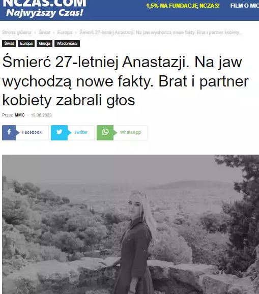 Στο ίδιο μήκος κύματος το kozaczek.pl: «Η εξαφάνιση της Αναστάζια με καταγωγή το Βρότσλαβ. Ο υπουργός Δικαιοσύνης Ziobro επιβεβαιώνει τον θάνατο της 27χρονης στο νησί της Κω» ενώ το goniec.pl γράφει ότι «ο Zbigniew Ziobro ανακοίνωσε βήματα σχετικά με τον θάνατο της Αναστασίας. Ο υπουργός Δικαιοσύνης αποκάλυψε τι θα κάνουν οι ανακριτές. Ο πολιτικός ανακοίνωσε τα επόμενα βήματα. Η πολωνική δικαιοσύνη δεν έχει καμία πρόθεση να παρακολουθεί παθητικά τις ενέργειες των ελληνικών υπηρεσιών».