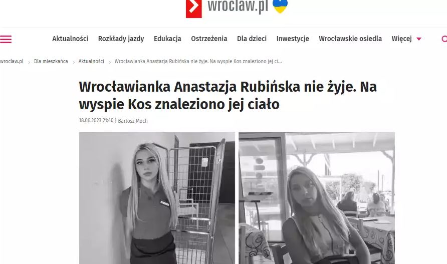 «Μπαράζ» δημοσιευμάτων από πολωνικά μέσα ενημέρωσης για τον μυστηριώδη θάνατο της 27χρονης Αναστάζια, που βρέθηκε νεκρή μετά από έξι ολόκληρες ημέρες ερευνών σε θάμνο κοντά στην περιοχή Αλυκές στο νησί της Κω. Ο πολωνικός τύπος κάνει εκτενή αναφορά στην αδικοχαμένη κοπέλα που έφυγε από το Βρότσλαβ, τον τόπο καταγωγής της, προκειμένου να δουλέψει το καλοκαίρι σε ξενοδοχείο του νησιού.