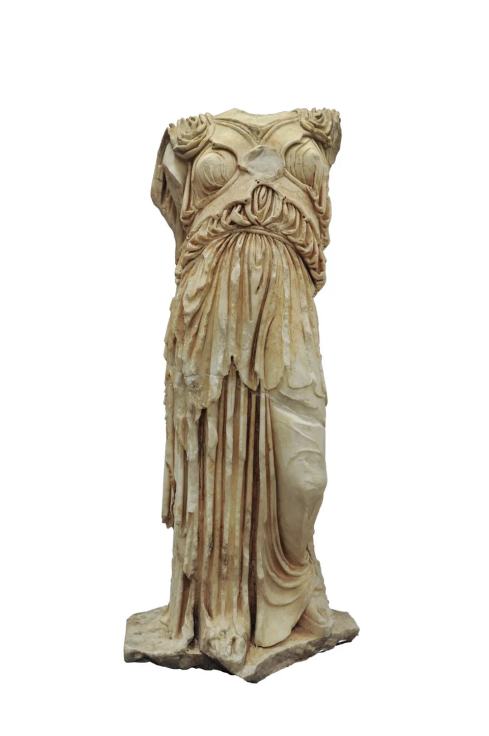 Τη συγκεκριμένη χρονολόγηση ενισχύει μαρμάρινο άγαλμα της Αθηνάς, που βρέθηκε εντοιχισμένο ως οικοδομικό υλικό στα θεμέλια του δυτικού πεσσού του Μπεζεστενίου. Το άγαλμά της Αθηνάς χρονολογείται στην Αδριάνεια περίοδο (117-138 μ.Χ) και αποτελεί ένα από τα καλύτερα αντίγραφα του λεγόμενου τύπου Ince, τα πρότυπα του οποίου ανιχνεύονται σε πρωτότυπες κλασικές δημιουργίες του 5 ου αι. π.Χ.