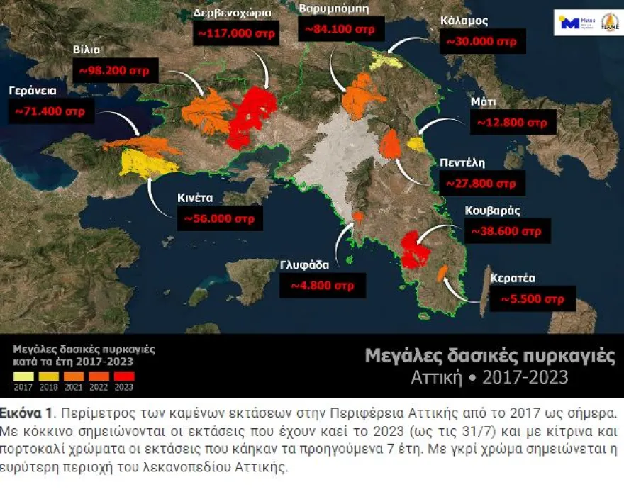Η συνολική επιφάνεια της Περιφέρειας Αττικής (χωρίς την περιοχή της Τροιζηνίας, των νησιών και του Λεκανοπεδίου) είναι 2.500.0000 στρέμματα, οπότε τα τελευταία 7 έτη το 23% της συνολικής επιφάνειας έχει καεί από δασικές πυρκαγιές.