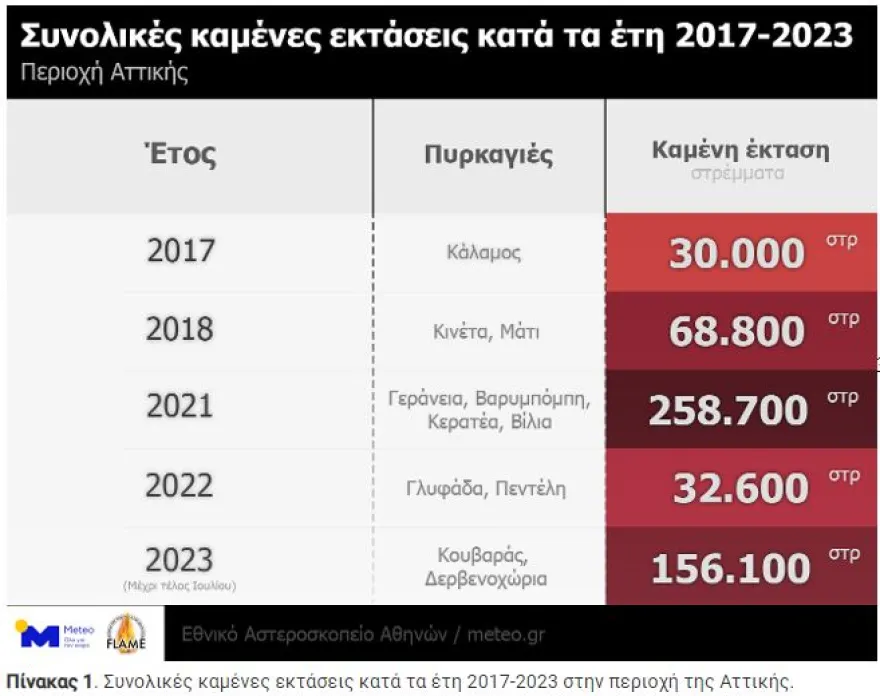 Το Εθνικό Αστεροσκοπείο Αθηνών/ meteo.gr έδωσε στο «φως» της δημοσιότητας τα αποτελέσματα που προκύπτουν από την ανάλυση των καμένων εκτάσεων από τις δασικές πυρκαγιές από το 2017 ως σήμερα, στην Περιφέρεια Αττικής.