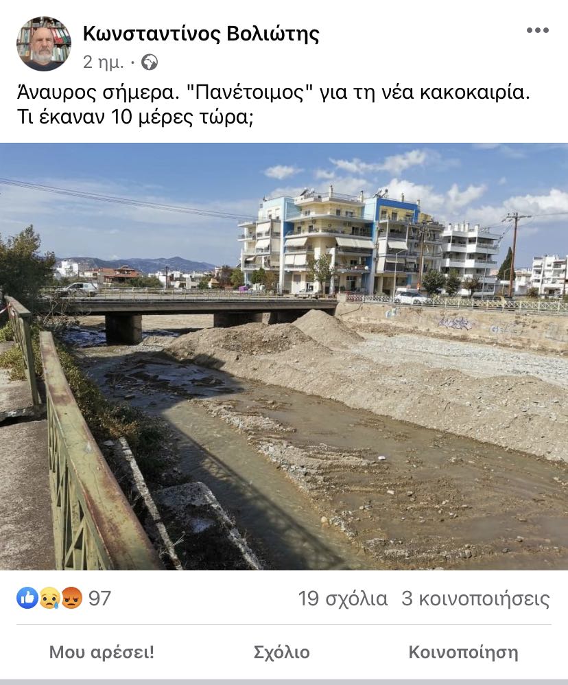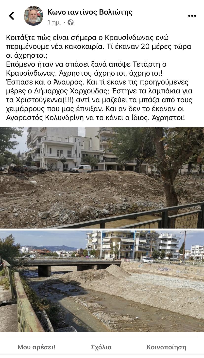 Ακολούθησε νέα ανάρτηση, την Τρίτη το απόγευμα γράφοντας: «Κοιτάξτε πώς είναι σήμερα ο Κραυσίδωνας ενώ περιμένουμε νέα κακοκαιρία. Τί έκαναν 20 μέρες τώρα οι άχρηστοι;».
