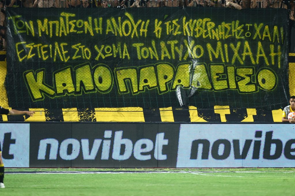 PRONEWS.GR / Ελληνικό Ποδόσφαιρο Πανό με ευθεία κατηγορία προς την κυβέρνηση για τη δολοφονία του Μιχάλη από τους οπαδούς του Άρη 10.08.2023 | 22:00