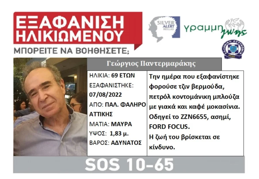 PRONEWS.GR / Εσωτερική Ασφάλεια Silver Alert: Εξαφανίστηκε 69χρονος από το Παλαιό Φάληρο 09.08.2022 | 12:53
