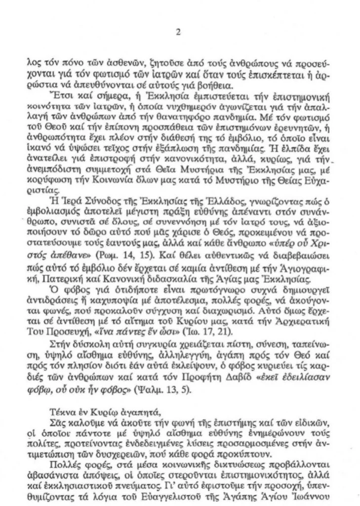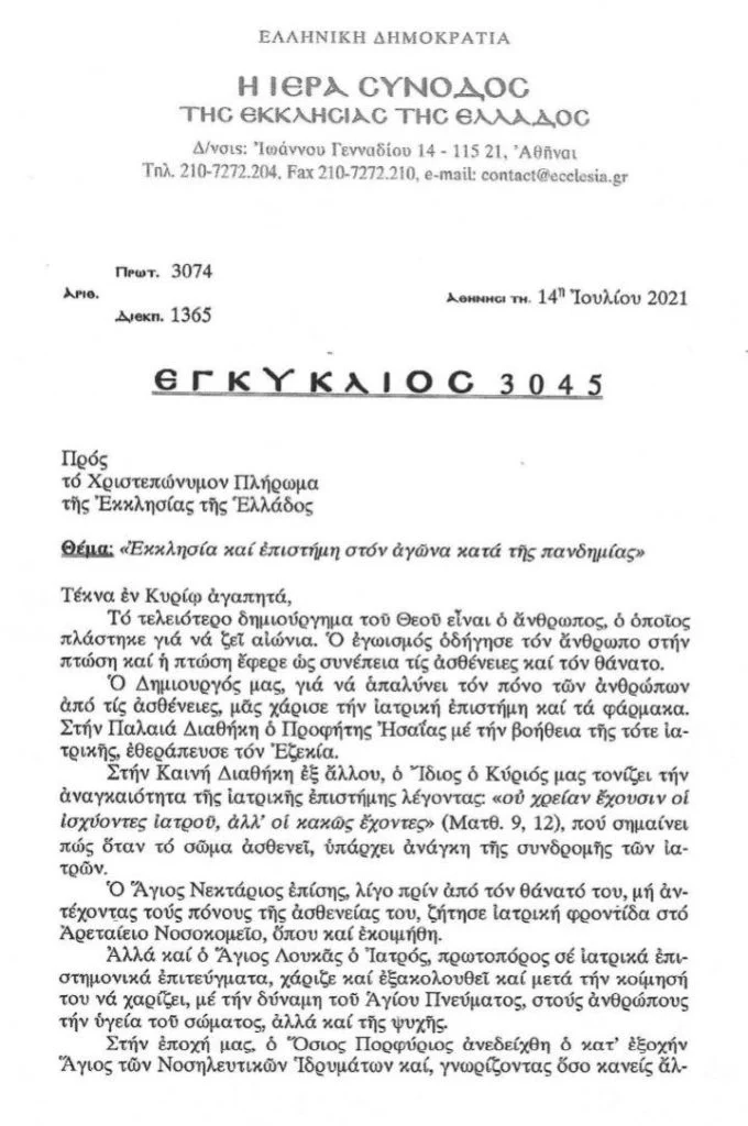 Δεν «άντεξε» η Ιερά Σύνοδος για το εμβόλιο: «Θα διαβάσουμε εγκύκλιο ώστε οι πιστοί να ακούνε την Επιστήμη»!