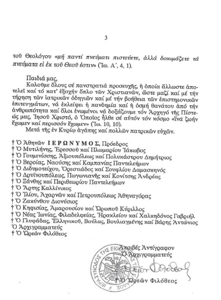 Eγκύκλιο απέστειλε η Διαρκής Ιερά Σύνοδος προς όλους τους ναούς προκειμένου να διαβασθεί την Κυριακή, κατά τη διάρκεια της Θείας Λειτουργίας καθώς φαίνεται ότι δεν άντεξε στις κυβερνητικές πιέσεις που είχαν βρει και συμμάχους εντός της ιεραρχίας όπως το προηγούμενο διάστημα είχε φανεί.