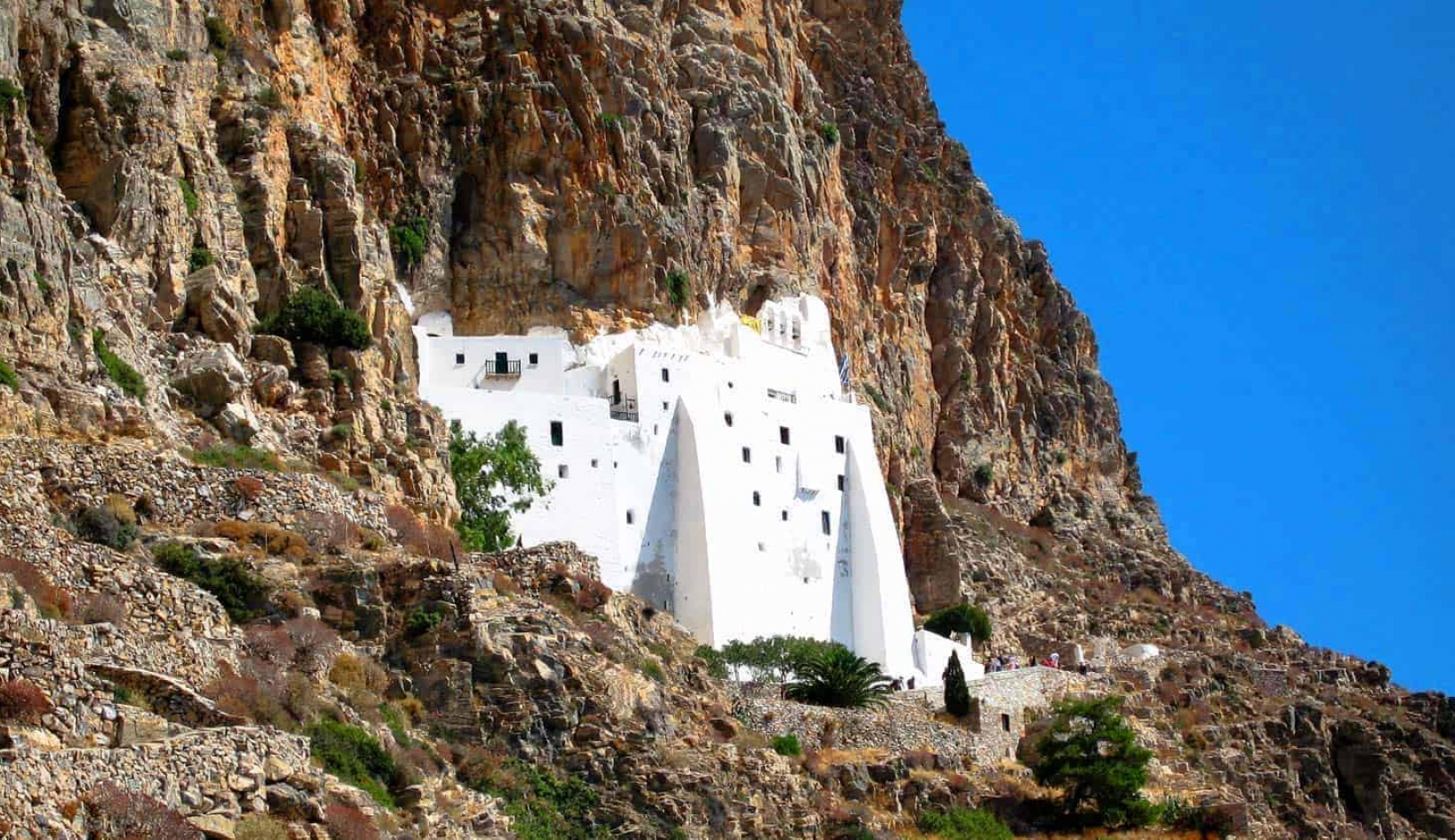 Η πάλλευκη πινελιά που σπάει τη μονοτονία του άγριου και βραχώδους τοπίο στο νότιο τμήμα του νησιού, αποτελεί μία από τις πιο χαρακτηριστικές εικόνες της Αμοργού, η οποία ταξιδεύει στα πέρατα του κόσμου. Σκαρφαλωμένη στους απειλητικούς και απόκρημνους βράχους, η Μονή της Παναγίας της Χοζοβιώτισσας στην Αμοργό, είναι ορατή μόνο από το πέλαγος, ενώ από μακριά μοιάζει με λευκή ζωγραφιά, με το Αιγαίο να απλώνεται 300 μέτρα πιο κάτω.