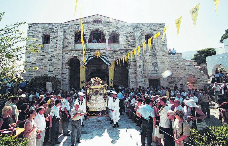 Ενα από τα σημαντικότερα προσκυνήματα της Ορθοδοξίας είναι στον παλαιοχριστιανικό ναό της Εκατονταπυλιανής στην Παροικιά της Πάρου. Χιλιάδες πιστοί επισκέπτονται κάθε χρόνο το νησί για να προσκυνήσουν τη θαυματουργή εικόνα του 17ου αιώνα, αλλά και να συμμετάσχουν στις εορταστικές εκδηλώσεις. Δεκάδες καΐκια καταφθάνουν στο λιμάνι, με τους πιστούς μέσα σε αυτά να κρατούν αναμμένα δαδιά.