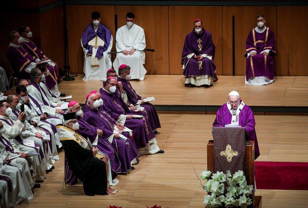 Θεία Λειτουργία στην κεντρική αίθουσα του Μεγάρου «Χρήστος Λαμπράκης», όπου βρίσκεται το μεγαλύτερο εκκλησιαστικό όργανο των Βαλκανίων, τέλεσε το απόγευμα ο Επίσκοπος και Πάπας της Ρώμης Φραγκίσκος.