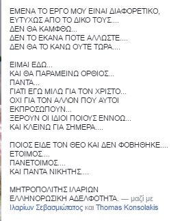 Παράλληλα, ο δήθεν Μητροπολίτης Ιλαρίων, ή αλλιώς Θωμάς Κονσολάκης, με ανάρτηση του στη σελίδα του Facebook “Ιερά Ελληνορωσική Μητροπολιτική Σύνοδος Ευρώπης”, δίνει σκληρή απάντηση σε όσους του ασκούν κριτική, επισημαίνοντας ότι «ανώμαλοι του έστησαν αυτό το σήριαλ» και ότι του «γίνεται πόλεμος».