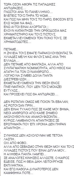 Ο “δεσπότης” με το κόκκινο ράσο καταλήγει στην ανακοίνωση γράφοντας: «Εμένα το έργο μου είναι ευτυχώς διαφορετικό από το δικό τους. Δεν θα καμφθώ. Δεν το έκανα ποτέ άλλωστε. Δεν θα το κάνω ούτε τώρα. Είμαι εδώ και θα παραμείνω όρθιος. Πάντα. Γιατί εγώ μιλώ για τον Χριστό. Όχι για τον άλλον που αυτοί εκπροσωπούν. Ξέρουν οι ίδιοι ποιους εννοώ. Και κλείνω για σήμερα. Ποιος είδε τον Θεό και δεν τον φοβήθηκε. Έτοιμος. Και πάντα νικητής».