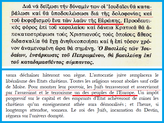 Διά να δείξωσι την δύναμίν των οι Ιουδαίοι θα καταβάλωσι και θα υποδουλώσωσι διά της δολοφονίας και του εκφοβισμού ένα των λαών της Ευρώπης. Προοδευτικός φόρος επί του κεφαλαίου και δάνεια Κρατικά θα αποκαταστρέψωσι τούς Χριστιανούς τούς οποίους άθεος διδασκαλία θα έχει ανηθικοποιήσει και η επί τόσον χρόνον αναμενομένη ώρα θα σημάνει. Ὁ Βασιλεύς των Ιουδαίων, ενσάρκωσις του Πεπρωμένου, θα βασιλεύσει επί του καταδαμασθέντος σύμπαντος.
