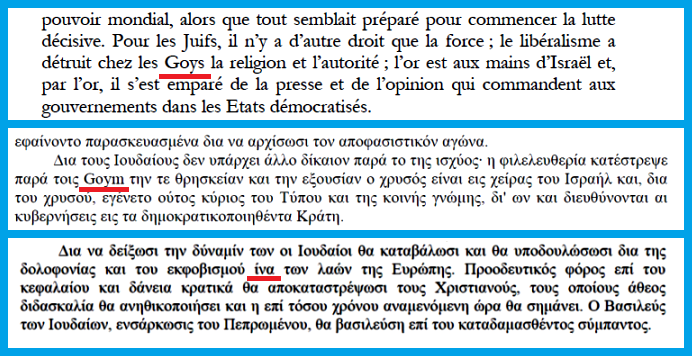 Η τελευταία πρόταση του κειμένου δείχνει απροκάλυπτα τους σκοπούς των σιωνιστών αλλά και την δύναμη της Ελλάδος. Όταν θα ξεμπερδέψουν με την Ελλάδα, τότε ο Βασιλεύς των Ιουδαίων, δηλαδή αυτός που ονομάζουμε Αντίχριστος, θα βασιλεύσει στο καταδαμασθέν σύμπαν.