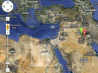 Όλο αυτό μας προσδιορίζει, την τοποθεσία της Βαβυλώνας -το πράσινο σημάδι-, πολύ κοντά στο μήκος και πλάτος που μας δίνουν οι παραπάνω υπολογισμοί, δηλαδή, 32° 4′ 0″ Βόρεια, 45° 29′ 0″ Ανατολικά -το πορτοκαλί σημάδι με το Α. (Η περιοχή σχετίζεται άμεσα με την Ερπετοειδή Αδελφότητα και την γένεση των Μασόνων).