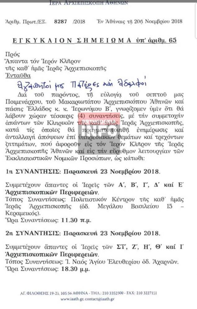 Τους ιερείς της Αρχιεπισκοπής θα ενημερώσει ο Μακαριώτος Ιερώνυμος σχετικά με το μισθολογικό των κληρικών.