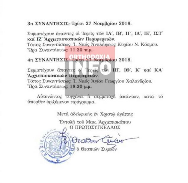 Σύμφωνα με εγκύκλιο σημείωμα που απέστειλε πριν από λίγο η Αρχιεπισκοπή στους κληρικούς της το οποίο υπογράφει ο πρωτοσύγκελλος επίσκοπος Θεσπιών Συμεών, οι συναντήσεις θα πραγματοποιηθούν σε τέσσερα διαφορετικά σημεία της Αρχιεπισκοπής προκειμένου το σύνολο των κληρικών να ενημερωθεί για «υπηρεσιακά θέματα και τρέχοντα ζητήματα».