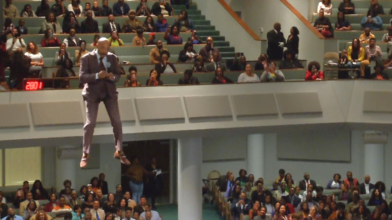 Ο πάστορας κατέβηκε από τον εξώστη της εκκλησίας κρεμασμένος σε ένα σχοινί από το ταβάνι με τους πιστούς να τον υποδέχονται γελώντας και φωνάζοντας «Αμήν».