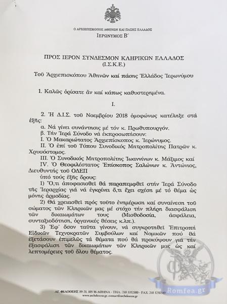 Ιερώνυμος προς ιερείς: «Θα υπερασπιστώ τα δικαιώματά σας» – Ολόκληρο το υπόμνημα του Αρχιεπίσκοπου