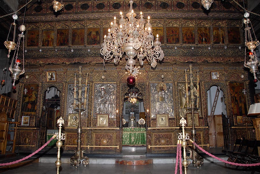 Ο Ιερός Ναός εσωτερικά (δίπλα στο καθολικό). Εκεί που διακρίνεται η μορφή του μοναχού, κατεβαίνει κανείς τα σκαλοπάτια και βρίσκεται μπροστά στο Άγιο Σπήλαιο της Γεννήσεως του Χριστού