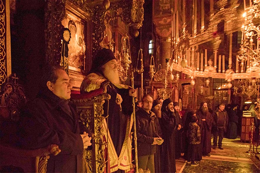 Μια μοναδική πνευματική εμπειρία έζησαν οι φιλοξενούμενοι και οι επισκέπτες της Μονής Βατοπεδίου, στο χιονισμένο Άγιο Όρος. Το βράδυ της Κυριακής και το ξημέρωμα της Δευτέρας 7 Ιανουαρίου, τελέστηκε με βυζαντινή μεγαλοπρέπεια η ολονύκτια αγρυπνία για την εορτή των Χριστουγέννων, σύμφωνα με το αγιορείτικο ημερολόγιο.