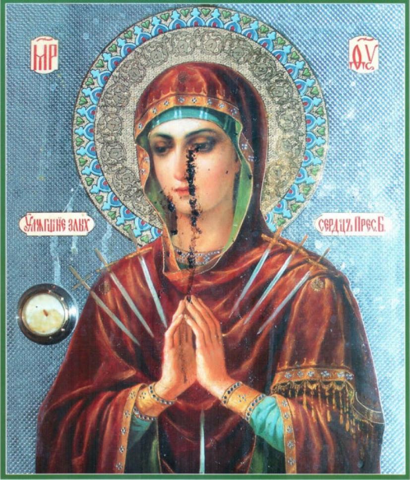 Στις 12 Αυγούστου 2000, την ημέρα αυτή βυθίστηκε το υποβρύχιο «Κούρσκ», εμφανίστηκαν κηλίδες αίματος τόσες που θα μπορούσαν να συλλέγονται σε ένα βαμβάκι. Έμειναν οι πληγές στον αριστερό της ώμο, στην λαβή και στο λαιμό της Παναγίας και υπάρχει μέχρι σήμερα μία κόκκινη πληγή. Και στις 11 Σεπτεμβρίου 2001 όταν κατέρευσαν οι δίδυμοι πύργοι.