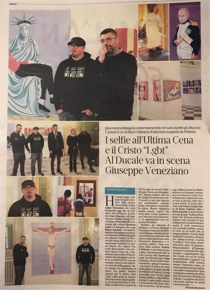 Την είδηση μεταφέρει ο πρόεδρος της επιτροπής ίσων ευκαιριών της Καράρας Αλεσάντρο Μπαντόνι, ο οποίος είχε δημοσιεύσει στη σελίδα του στο Facebook φωτογραφίες από την έκθεση «Storytelling» του Βενετσιάνο, η οποία εγκαινιάσθηκε το περασμένο Σάββατο στο Παλάτσο Ντουκάλε της Μάσα και θα διαρκέσει έως τις 24 Φεβρουαρίου.