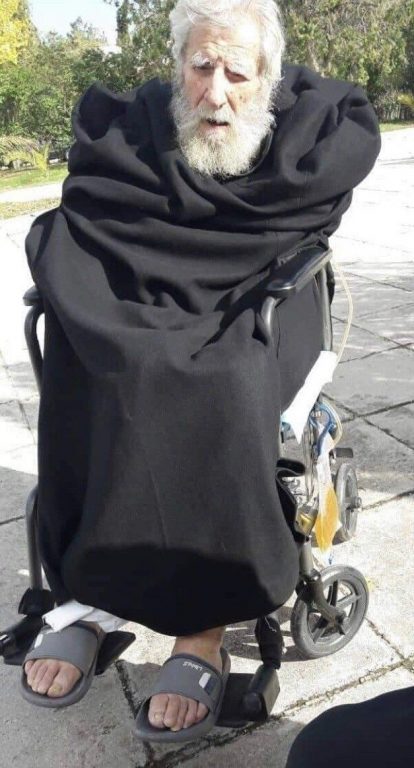 Και το ακόμη πιο τραγικό : ξεκάλτσωτος και με ανοιχτές παντόφλες για να αναδεικνύουν επαρκώς τους ευρισκόμενους σε αθλία κατάσταση όνυχες των ποδιών του . Μόνο το ράσο που έχουν ρίξει πάνω του μαρτυρεί ότι το γεροντάκι αυτό μπορεί να είναι και ιερωμένος!