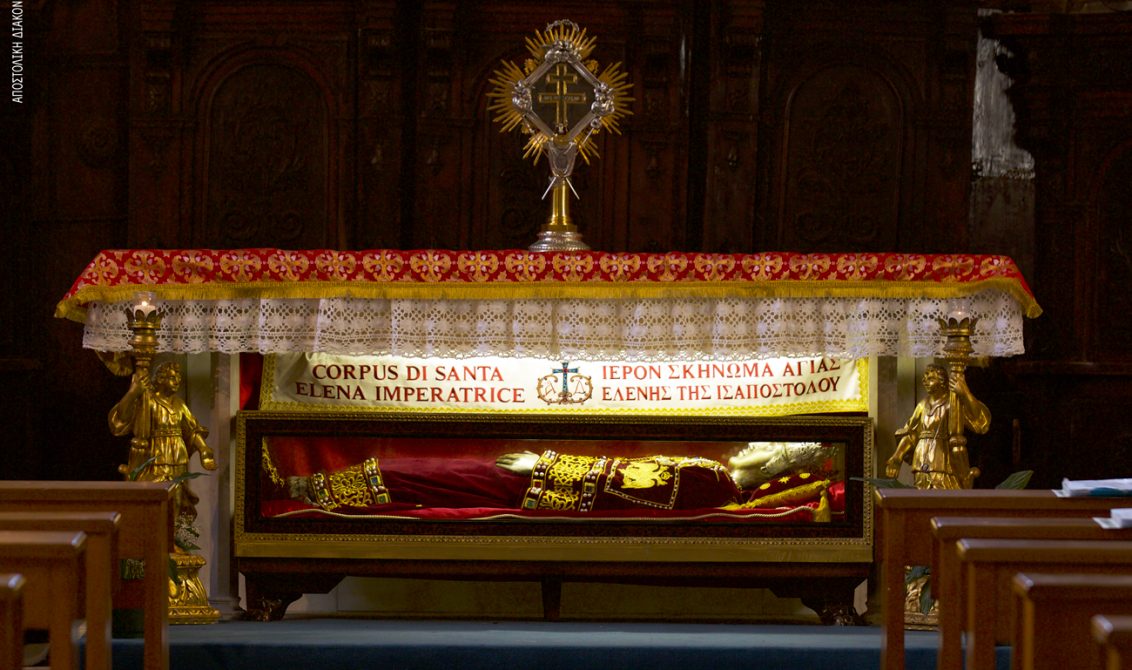 Το ιερό σκήνωμα της Αγίας Ελένης είναι τοποθετημένο εντός λάρνακας σε δύο λειψανοθήκες.