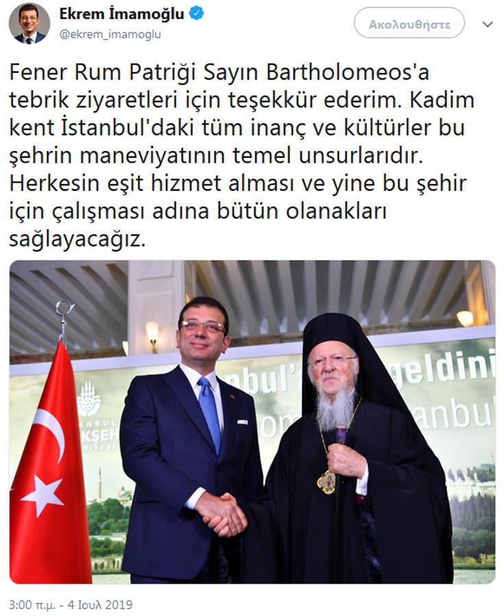 «Θα ήθελα να ευχαριστήσω τον κ. Βαρθολομαίο, τον Πατριάρχη του Φαναρίου, για την επίσκεψή του. Όλες οι πεποιθήσεις και οι κουλτούρες στην αρχαία πόλη της Κωνσταντινούπολης είναι βασικό συστατικό της πνευματικότητας της πόλης. Θα παρέχουμε τις ευκαιρίες σε όλους να έχει ίσα αντιμετώπιση και να εργαστεί για την πόλη», έγραψε στο Twitter o Ιμάμογλου.