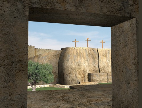 Ο βράχος του Γολγοθά την εποχή του Χριστού μέσα στους κήπους-οπωρώνες του αρχαίου λατομείου (κοιτάζουμε ανατολικά).