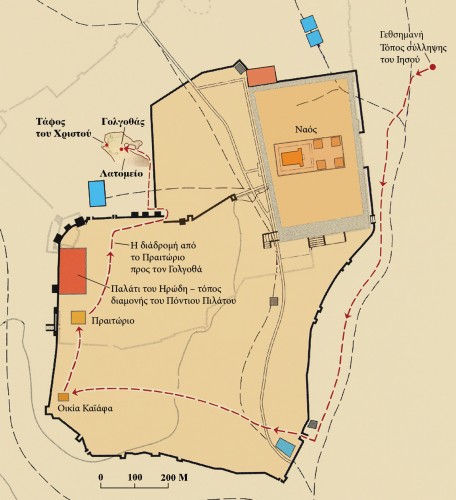 Διακρίνουμε τις θέσεις του Παναγίου Τάφου και του Γολγοθά μέσα στο αρχαίο λατομείο. Με τη διακεκομμένη γραμμή εικονίζεται η διαδρομή που ακολούθησε ο Ιησούς από τον τόπο της σύλληψής του προς την οικία του Καϊάφα, και ακολούθως προς το Πραιτώριο και τον Γολγοθά (σχέδιο χάρτη Χ. Σκαρλακίδης).