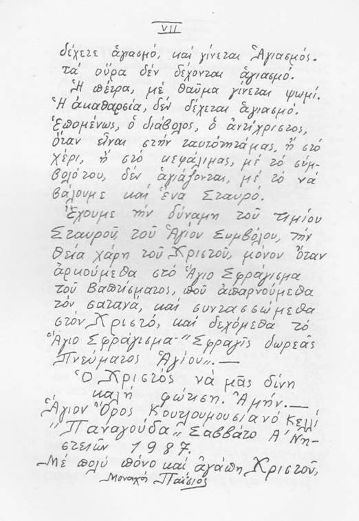 Το χειρόγραφο του Άγιου Παΐσιου αποτελείται από 8 σελίδες, τις οποίες έχει αριθμήσει ο ίδιος ο Γέροντας.