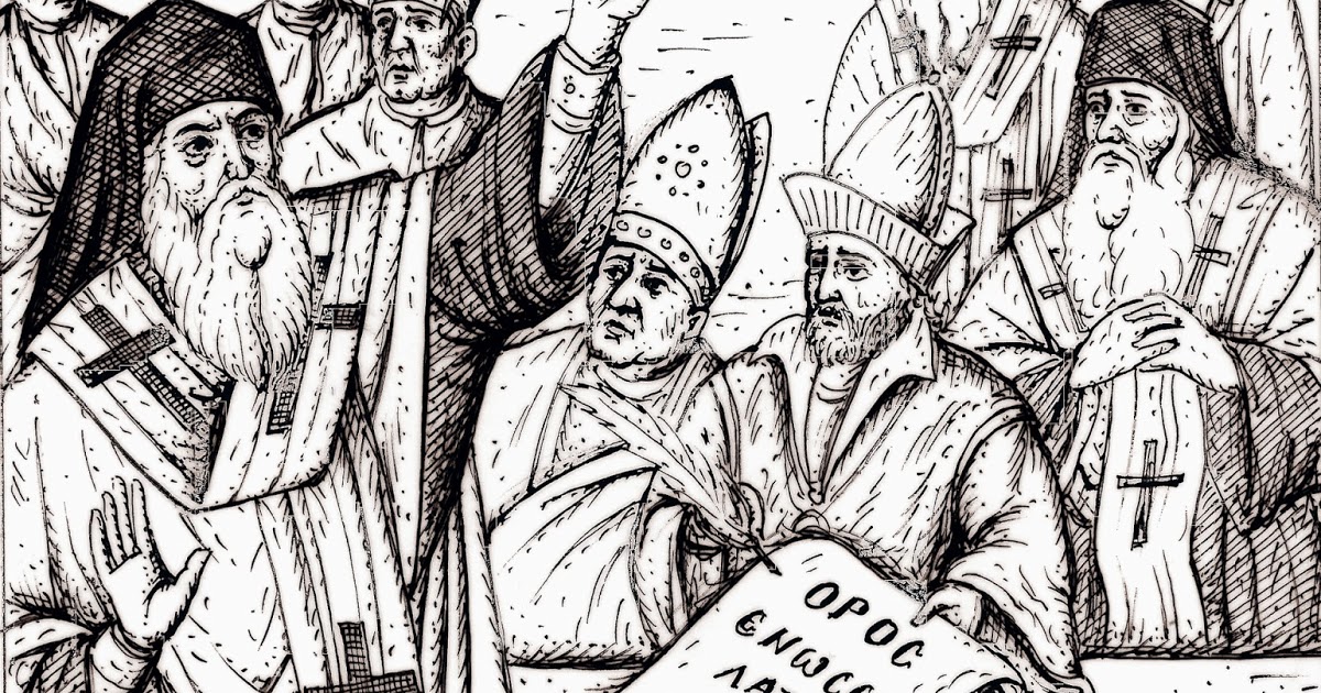 Στους διαλόγους, σημειώνονται τα λόγια του Εφέσου Αγ. Μάρκου Ευγενικού και των ομογνωμόνων του, ενώ με μπλε των φιλοπαπικών “Ορθοδόξων” και εχθρών του Αγ. Μάρκου.