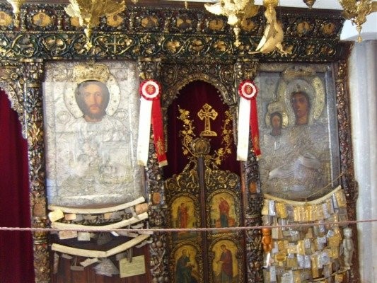 Η θαυματουργή εικόνα της Παναγίας, είναι επενδυμένη με ασήμι και έχει δυο όψεις. Στο ένα μέρος είναι η Παναγία που κρατάει το Χριστό και στο άλλο εικονίζεται ο Άγιος Νικόλαος. Είναι φιλοτεχνημένη με την τεχνοτροπία της ρώσικης σχολής και στο αριστερό χέρι της Παναγίας βρίσκεται ζωγραφισμένη, η μικρή εικόνα που είχε ανακαλυφθεί από το βοσκό.
