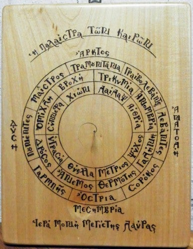 Πρόκειται για μια παραλληλόγραμμη επιφάνεια ξύλου, πάνω στην οποία είναι σχεδιασμένο (με μελάνι, ή σκαλιστό, ή πυρογραφία) ένας κύκλος, που μέσα του φέρει ακόμα τρεις κύκλους, οι οποίοι είναι χωρισμένοι σε ονομασίες καιρικών συνθηκών και κατεύθυνση ανέμων.