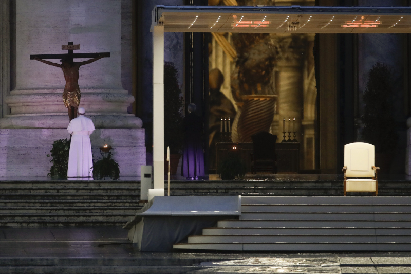 «Μεγάλο σκότος κάλυψε τις πόλεις μας, τους δρόμους και τις πλατείες μας. Κυρίευσε τις ζωές μας, γεμίζοντας τα πάντα με μια απελπιστική σιωπή, ένα απελπιστικό κενό, τα οποία παραλύουν κάθε τι στο πέρασμά τους. Το αισθανόμαστε διάχυτο παντού, είναι ξεκάθαρο στα βλέμματα και στις κινήσεις μας», υπογράμμισε ο πάπας Φραγκίσκος.