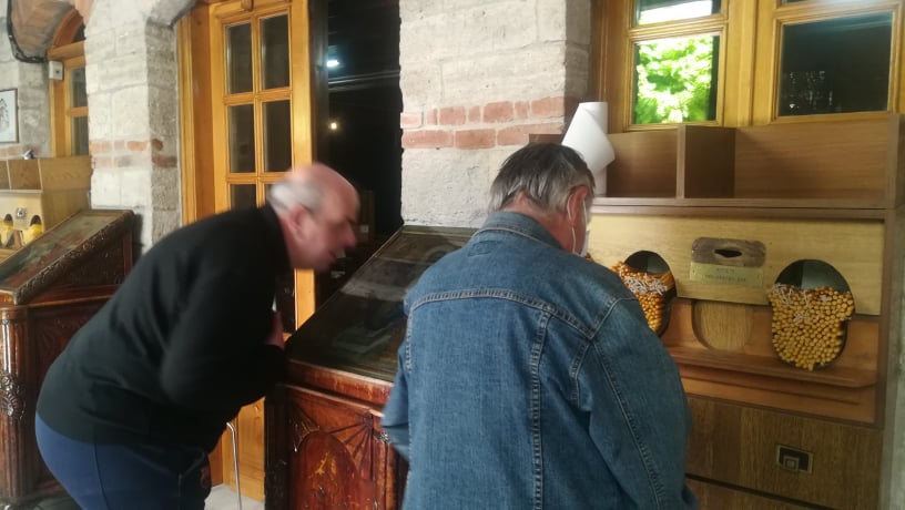 «Οι πιστοί τηρούν τις αποστάσεις. Ασπάζονται τις εικόνες, δε μπορεί κανείς να τους το απαγορεύσει αυτό, αλλά εμείς λαμβάνουμε όλα τα μέτρα καθαριότητας», λέει ο ιερέας της εκκλησίας, πατέρας Χρήστος Δαλαγεώργος.