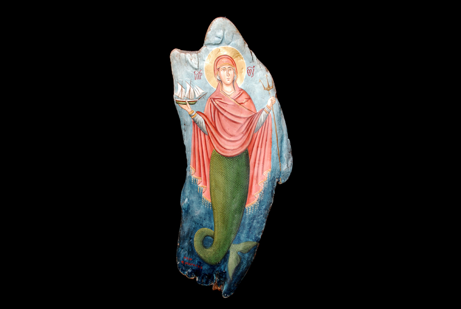 Εκεί βρίσκεται και η εικόνα της Παναγίας η οποία δεν εικονίζεται όπως την έχουμε γνωρίσει από τις γνωστές απεικονίσεις της, αλλά ως γοργόνα! Στην εικόνα αυτή, η Παναγία εμφανίζεται με ανθρώπινη μορφή από την μέση και πάνω ενώ από την μέση και κάτω, έχει σώμα ψαριού όπως ακριβώς δηλαδή και οι γνωστές γοργόνες της μυθολογίας. Κανείς δεν ξέρει τι ήταν αυτό που οδήγησε τον άγνωστο λαϊκό καλλιτέχνη στο να απεικονίσει την Παναγία ως γοργόνα.
