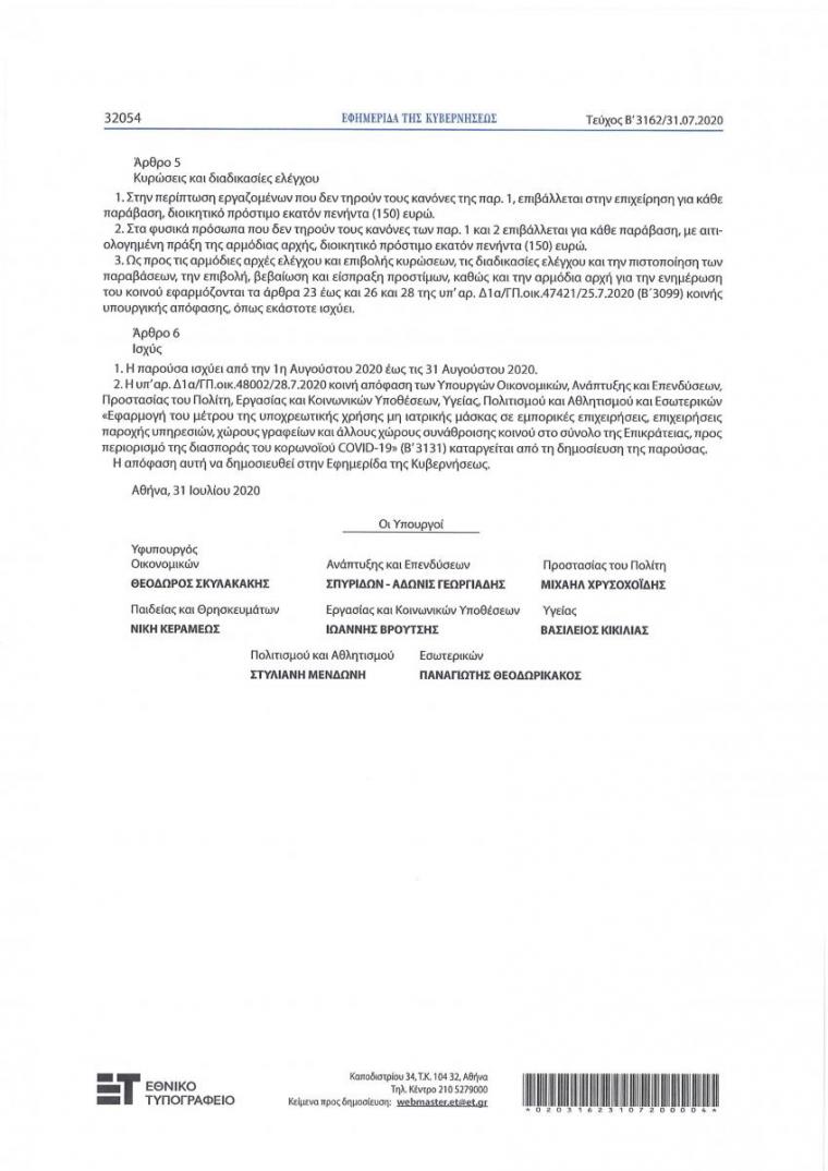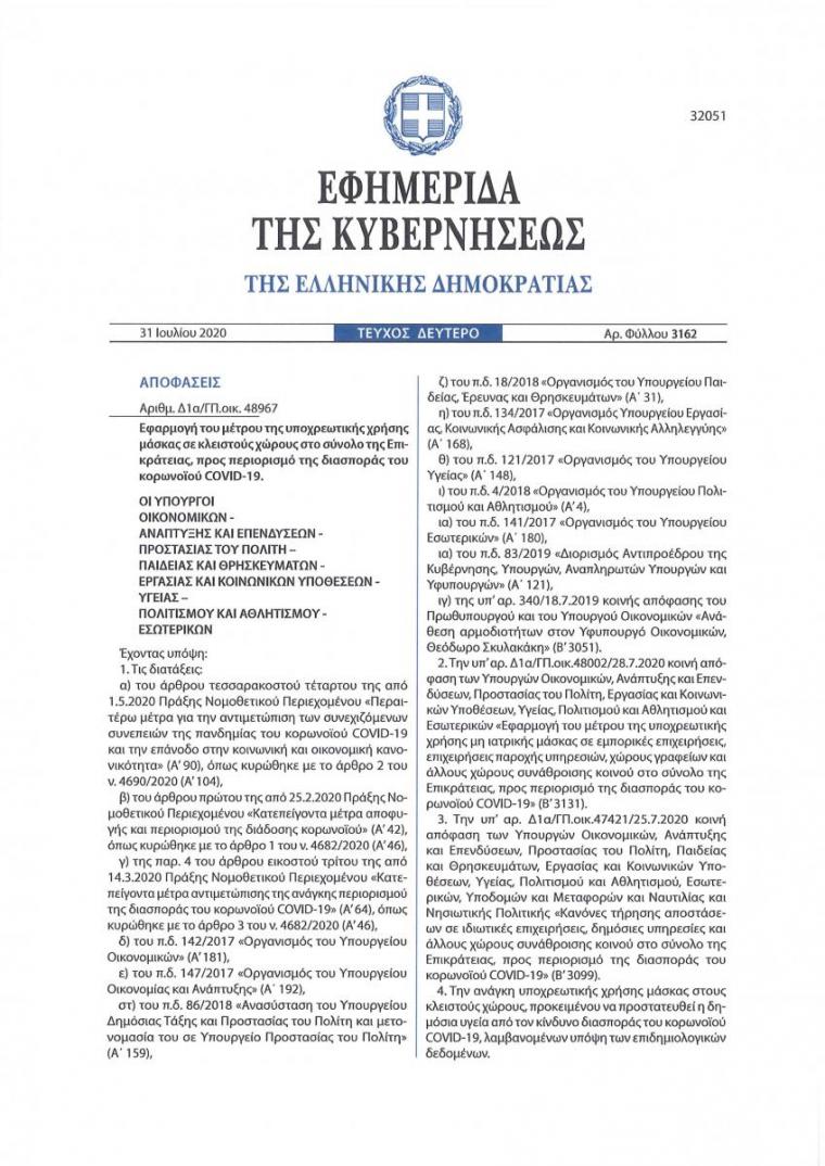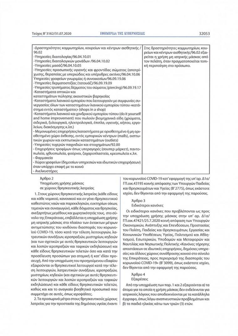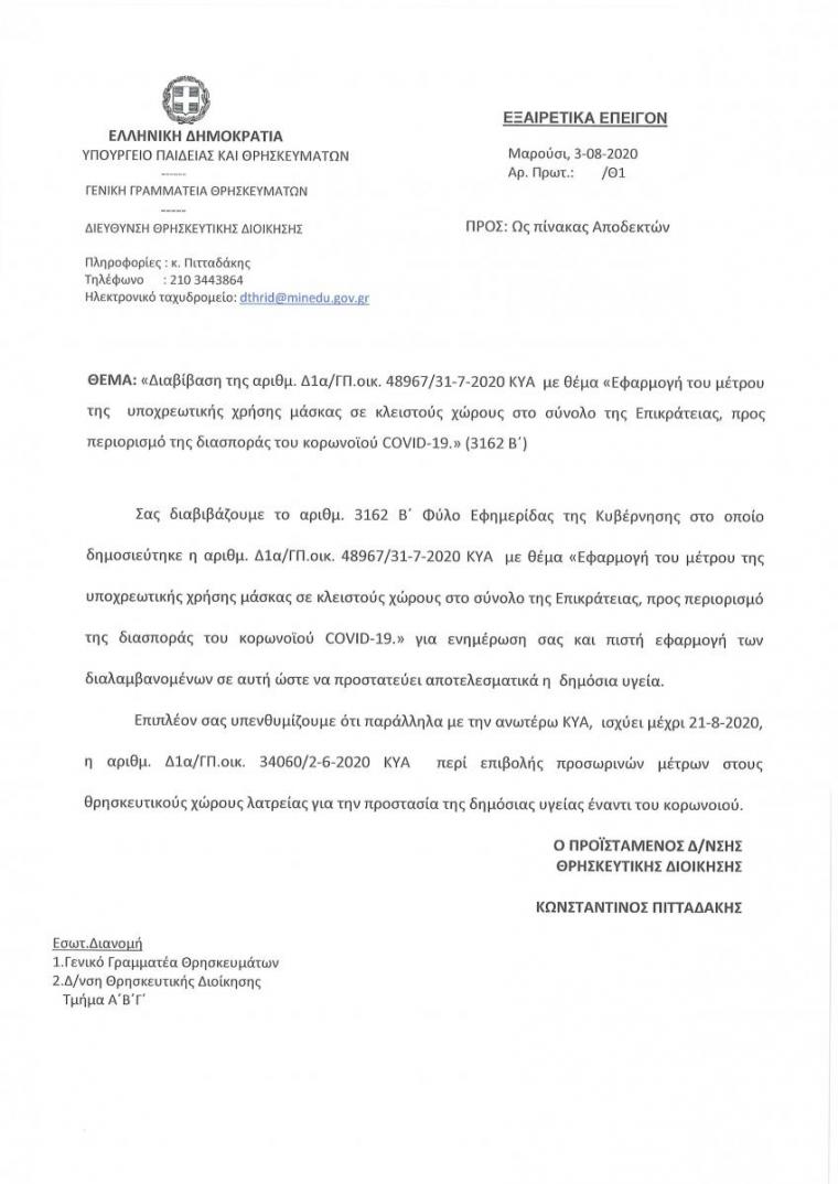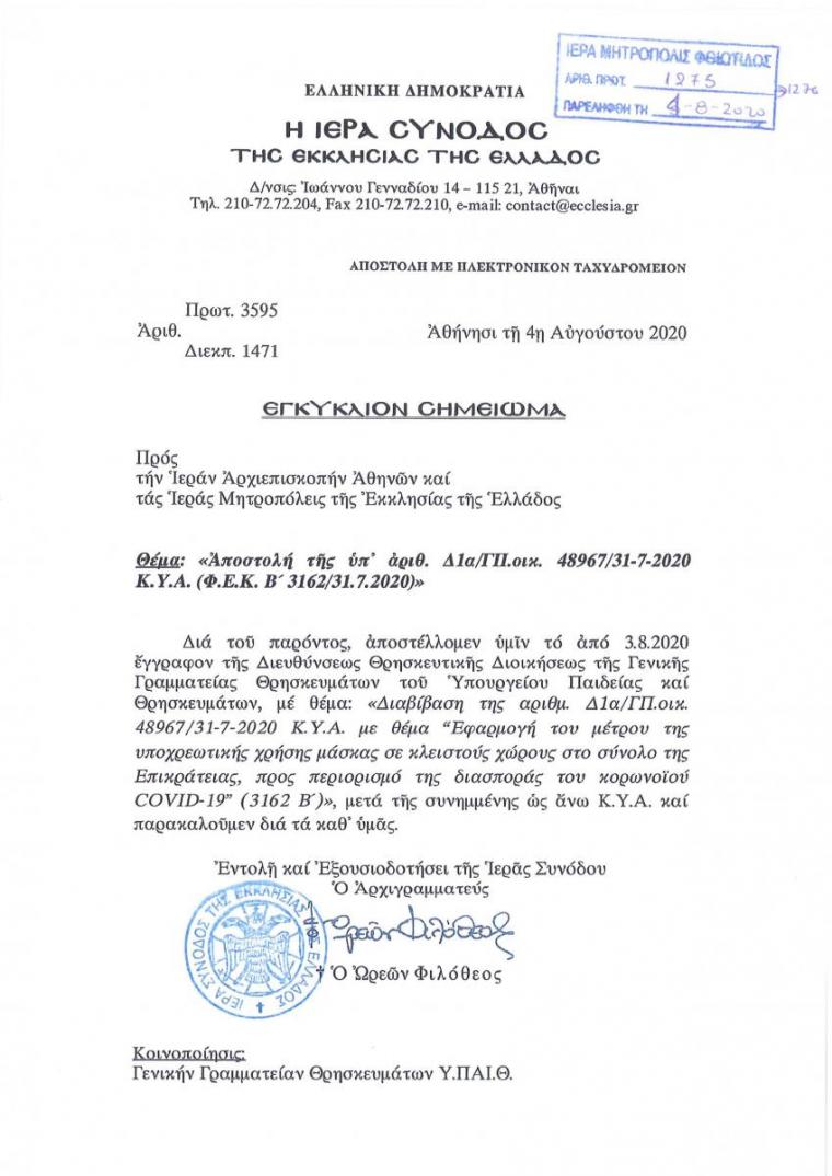 Παρακάτω ακολουθεί εγκύκλιο σημείωμα της Ιεράς Συνόδου με θέμα: «Αποστολή της υπ’ αρίθμ. Δ1α/ΓΠ.οικ 48967/31-7-2020 Κ.Υ.Α. (ΦΕΚ Β΄ 3162/31.7.2020)».