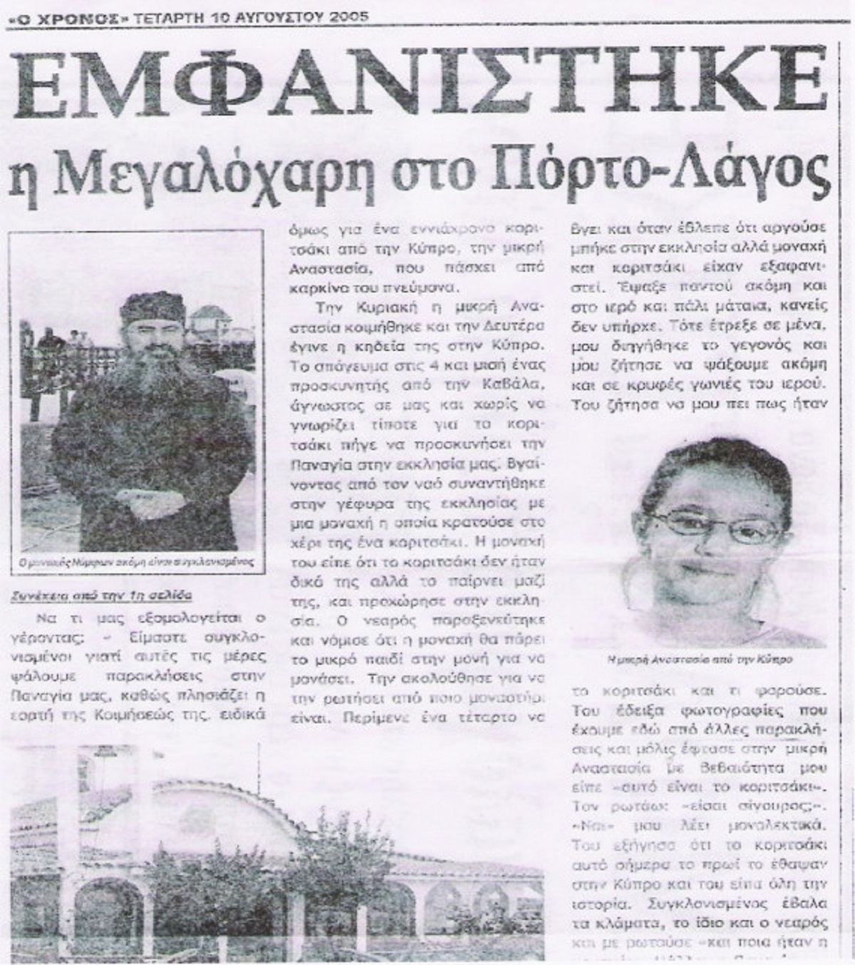 Διαβάστε το ανατριχιαστικό περιστατικό που συνέβη στο Πόρτο Λάγοας τον Αύγουστο του 2005. Δείτε τι έγραψε εφημερίδα την εποχή εκείνη: «Είμαστε συγκλονισμένοι γιατί αυτές τις ημέρες ψάλλαμε παρακλήσεις στην Παναγία μας, για την εορτή της Κοιμήσεώς της, ειδικά όμως για ένα εννιάχρονο κοριτσάκι από την Κύπρο, την μικρή Αναστασία, που έπασχε από καρκίνο του πνεύμονα.