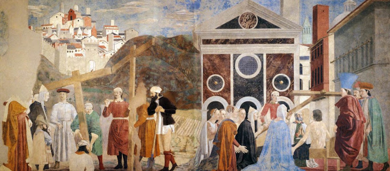 Η εύρεση και η αναγνώριση του Τιμίου Σταυρού, τοιχογραφία, 1452-66, Piero della Francesca, Arezzo. Αριστερά, απεικονίζεται η εύρεση των τριών σταυρών, ενώ δεξιά η αναγνώριση του Τιμίου Σταυρού δια θαύματος.