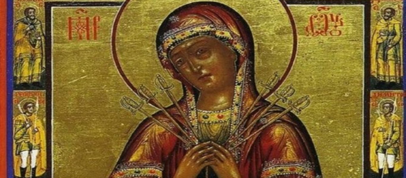Στην πλέον ασυνήθιστη εικόνα, η Παναγία εμφανίζεται με την καρδιά διαπερασμένη από επτά σπαθιά. Στον πιο συνηθισμένο εικονογραφικό τύπο βλέπουμε τεσσερα σπαθιά στα αριστερά και τρία στα δεξιά.