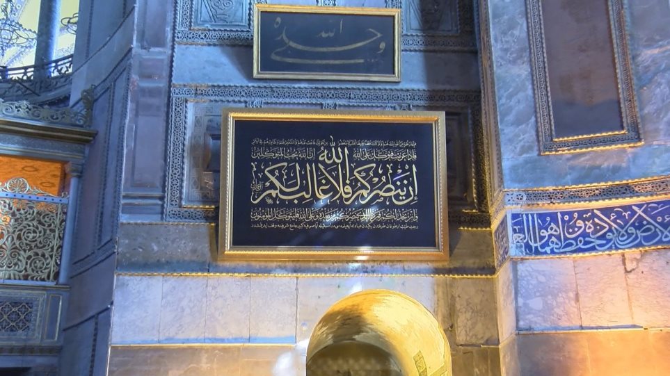 Έναν πίνακα, διακοσμημένο με καλλιγραφία που παραπέμει σε κεφάλαιο του Κορανίου, «κρέμασε» ο Ρετζέπ Ταγίπ Ερντογάν στην Αγία Σοφιά, την οποία μετέτρεψε ξανά σε τζαμί πριν από μερικούς μήνες, έπειτα από 86 χρόνια.