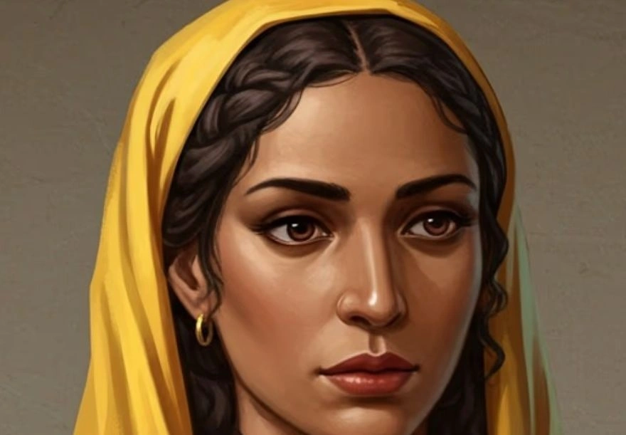 Τα μαλλιά της ήταν μακριά και σκούρα, πιθανώς πλεγμένα και δεμένα ψηλά, ίσως με μαντήλι ή φουλάρι, όπως έκαναν οι γυναίκες της Ιουδαίας ή των Ναβαταίων.