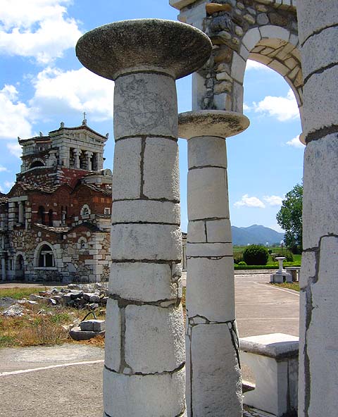 Το επίτευγμα του αρχιτέκτονα είναι ότι κατόρθωσε να κάνει έναν πολύ ιδιαίτερο συγκερασμό ανόμοιων στοιχείων. Ο επισκέπτης αναρωτιέται πώς γίνεται να συνδυάζονται με έναν μοναδικό τρόπο ψηφιδωτά δάπεδα, που απεικονίζουν αρχαίους μύθους και χριστιανικές ιστορίες,εσωτερικές καμάρες, κίονες και αετώματα, το κλασικό οκταγωνικό βυζαντινό σχέδιο μαζί με στοιχεία από τα ντόπια φτωχά καλύβια. Οι εκπλήξεις βέβαια δε σταματούν στο εσωτερικό του ναού. Ο περίβολός του είναι διακοσμημένος με αρχαιοελληνικές κατασκευές, ενώ οι αγιογραφίες του θυμίζουν και αυτές αρχαία Ελλάδα, με τα πρόσωπα των αγίων να παραπέμπουν σε αρχαίους Έλληνες φιλόσοφους.
