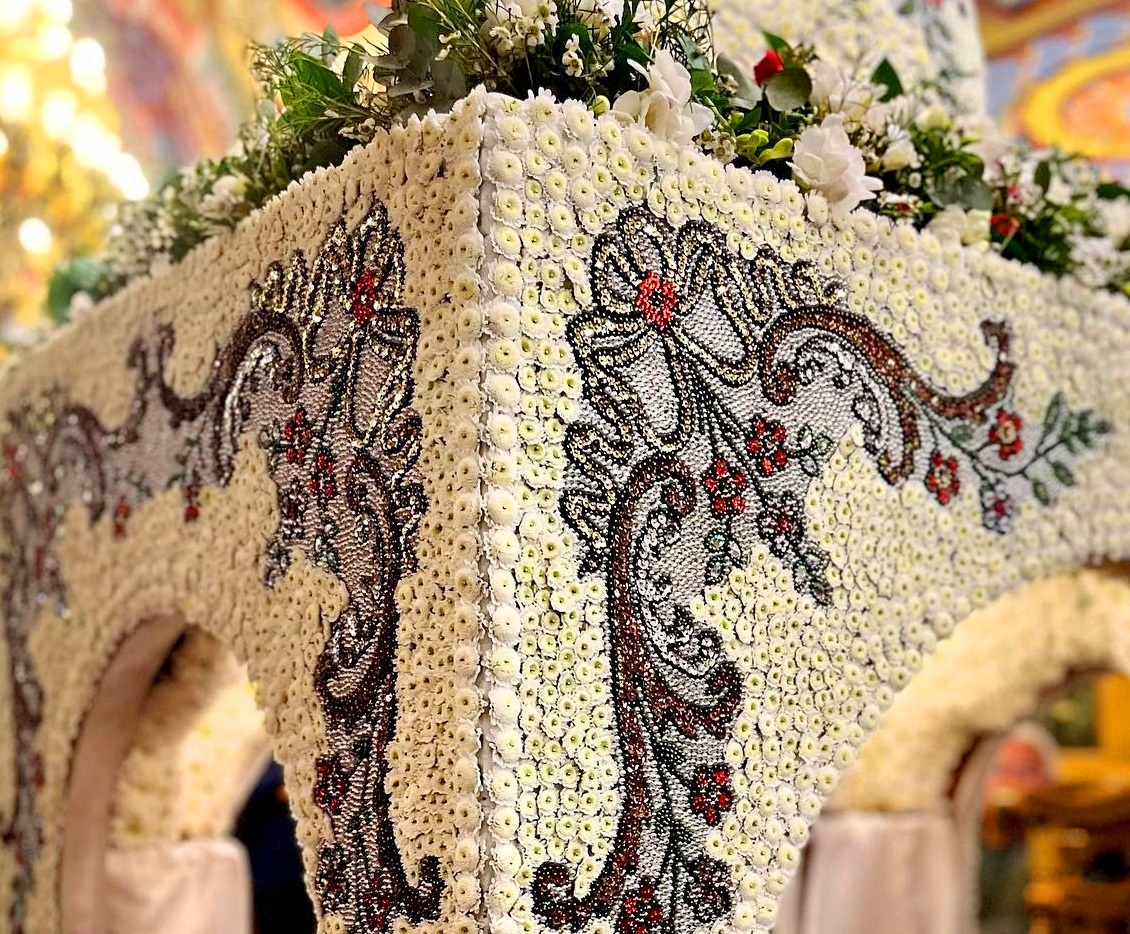 Η αρχή έγινε το 2003. Έκτοτε, κάθε Πάσχα, δεκάδες γυναίκες από περίπου 50 οικογένειες συγκεντρώνονται στον ναό. Από νωρίς το πρωί μέχρι το βράδυ, καθημερινά μέχρι και τη Μεγάλη Τετάρτη, δουλεύουν μεθοδικά και με ιερή αφοσίωση. Το βράδυ της Μεγάλης Τρίτης αρχίζει η σύνθεση με τα λουλούδια, και το έργο ολοκληρώνεται τη Μεγάλη Πέμπτη, μετά την Ακολουθία των Δώδεκα Ευαγγελίων.