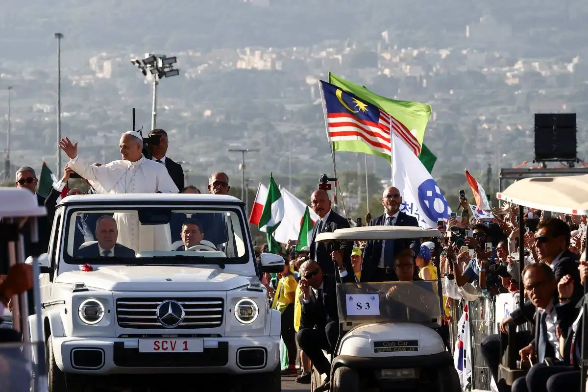 Ο προκαθήμενος της Καθολικής Εκκλησίας έφτασε με στρατιωτικό ελικόπτερο, προκαλώντας συγκίνηση και ενθουσιασμό στο πλήθος.