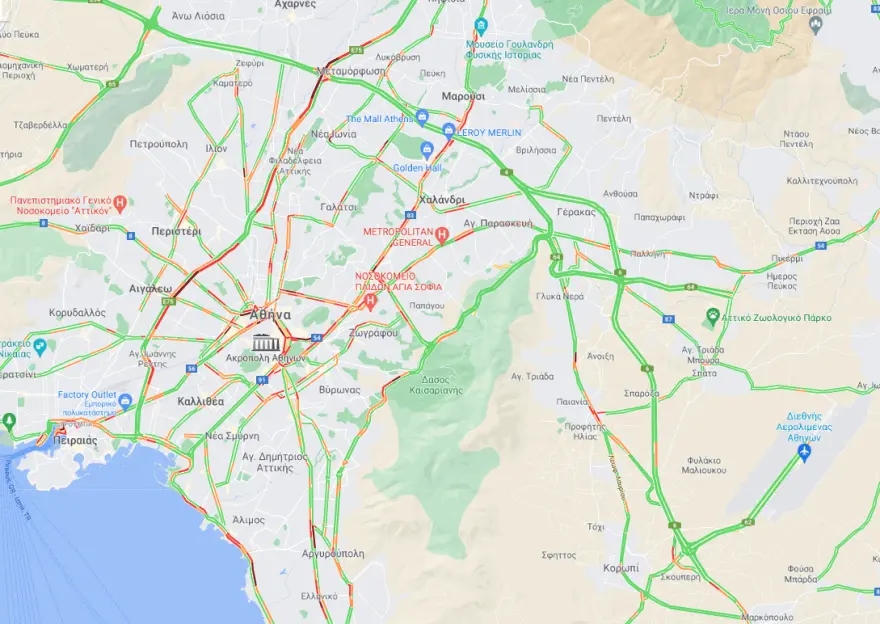 Χαμηλές ταχύτητες εντοπίζονται και στη λεωφόρο Βασιλίσσης Σοφίας στο ρεύμα προς Αθήνα και επί της λεωφόρου Βασιλέως Κωνσταντίνου, στο καθοδικό ρεύμα, από Χίλτον.
